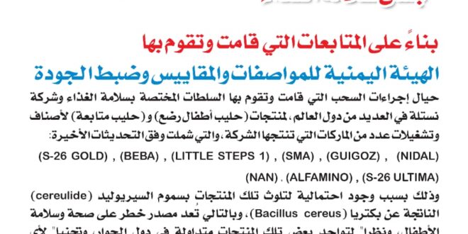الهيئة اليمنية للمواصفات تحذر من منتجات حليب الرضع وحليب المتابعة لشركة نستله (Nestlé)