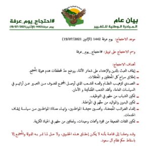 وحددت المبادرة يوم الإثنين عرفة 1442 الموافق 19/7/2021م يوم الخروج الجماهيري ضد حكم آل سعود وإسقاطه, وعنونت الحملة بهشتاق #احتجاج_يوم_عرفة .