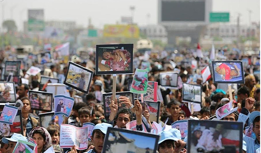 ورفع المشاركون في المسيرة، صور أطفال استشهدوا وأصيبوا جراء استهداف طيران العدوان الأمريكي السعودي على اليمن على مدى أكثر من ست سنوات، ولافتات منددة بالمواقف المخزية للأمم المتحدة وأمينها العام، تجاه ما يتعرض له أطفال اليمن من جرائم وانتهاكات من قبل تحالف العدوان.