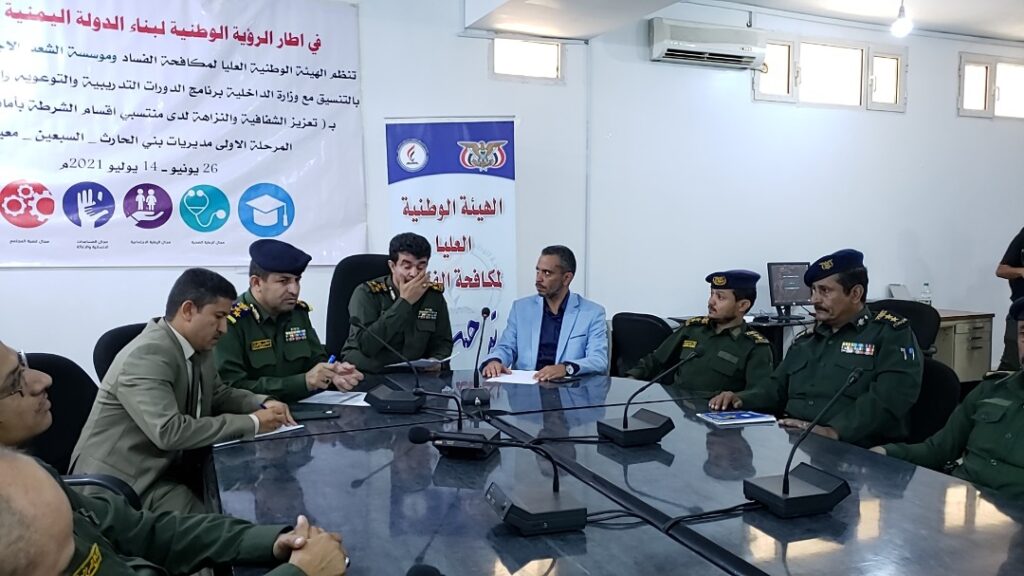 وكان رئيس دائرة التوعية التثقيف بالهيئة الوطنية العليا لمكافحة الفساد عادل علي أحمد العقبي قد أكد أن تنفيذ هذه الدورة التدريبية يأتي تنفيذا لأحكام القانون رقم (39) لسنة 2006 ميلادية بشأن مكافحة الفساد ولائحته التنفيذية وقانون هيئة الشرطة رقم (15) لسنة 2000م وتنفيذا لمضامين الرؤية الوطنية لبناء الدولة اليمنية الحديثة.