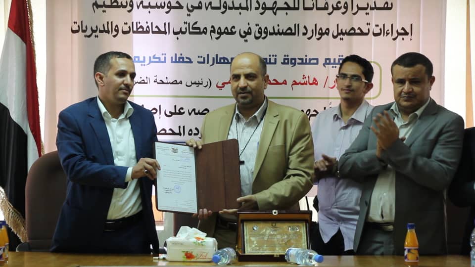 اقام صندوق تنمية المهارات امس بصنعاء احتفالا تكريميا لرئيس مصلحة الضرائب الدكتور/هاشم محمد الشامي عرفانا تقدير وعرفانا بجهوده المبذولة في حوسبة وتنظيم اجراءات تحصيل موارد الصندوق في عموم المكاتب في المحافظات والمديريات .