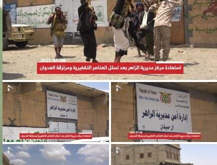 ونقلت فضائية المسيرة عن مصدر عسكري قوله إن “الجيش واللجان الشعبية تمكنوا بفضل الله من استعادة مركز مديرية الزاهر بالتعاون مع أبناء محافظة البيضاء”.