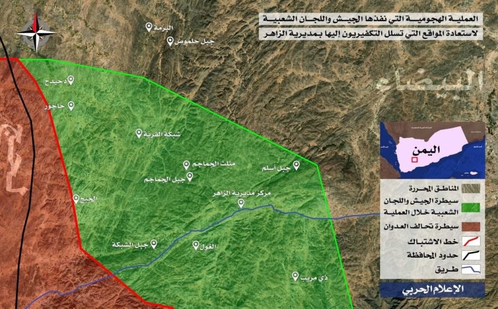 ونقلت فضائية المسيرة امس عن مصدر عسكري قوله إن “الجيش واللجان الشعبية تمكنوا بفضل الله من استعادة مركز مديرية الزاهر بالتعاون مع أبناء محافظة البيضاء”.