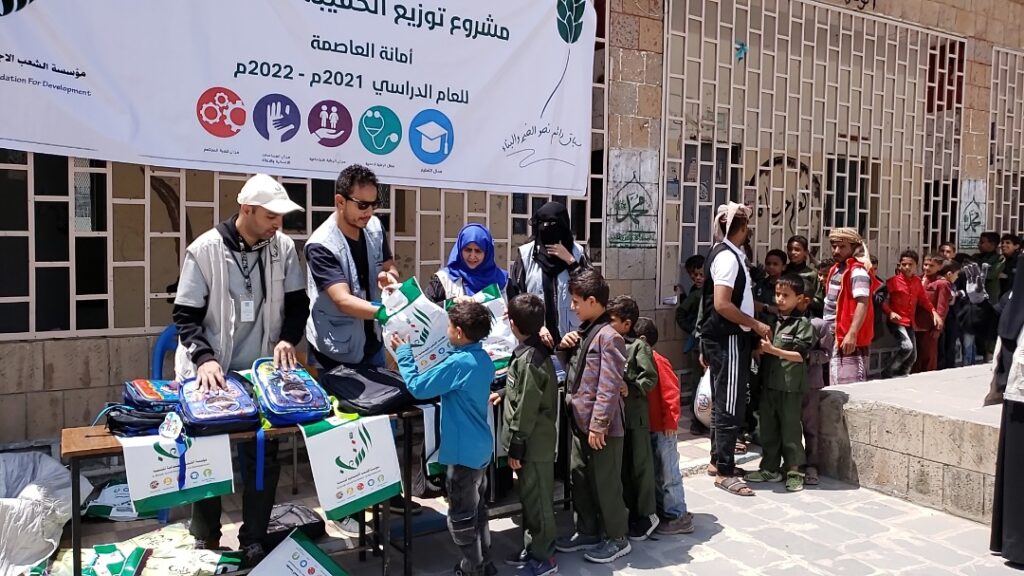 دشنت مؤسسة الشعب الاجتماعية للتنمية اليوم توزيع الحقيبة المدرسية والمستلزمات القرطاسية في أمانة العاصمة ومحافظة ريمة تحت شعار العودة إلى المدرسة.