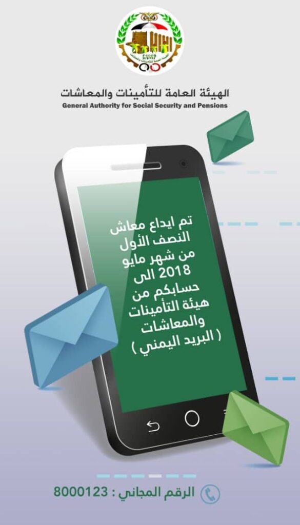 بدأت الهيئة العامة للتأمينات والمعاشات،بصرف النصف الأول من معاش شهر مايو 2018م للمتقاعدين المدنيين عبر مكاتب البريد في أمانة العاصمة والمحافظات.