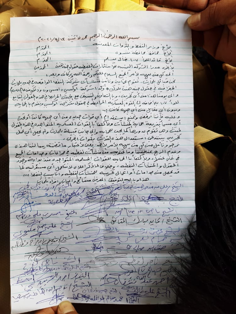 وعبرت قبائل بلحارث في رسالتها عن رفضها استقدام أي قوات جديدة من اي جهة كانت او تحت اي مسمى بذريعة حماية المنشآت والاكتفاء بالقوات العسكرية المتواجدة في هذه الحقول كونها تقوم بواجبها على أكمل وجه.