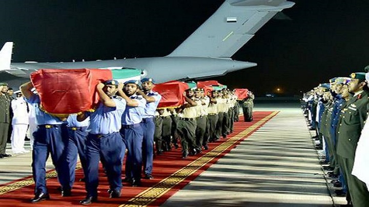 وذكرت القيادة العامة للقوات الإماراتية في بيان نقله الموقع الإلكتروني لوكالة الأنباء الإماراتية أن “الجنود القتلى هم: النقيب سعيد أحمد راشد المنصوري، الوكيل أول علي عبدالله أحمد الظنحاني، الوكيل أول زايد مسلم سهيل العامري، الوكيل أول صالح حسن صالح بن عمرو، الوكيل أول ناصر محمد حمد الكعبي، والرقيب سيف ضاوي راشد