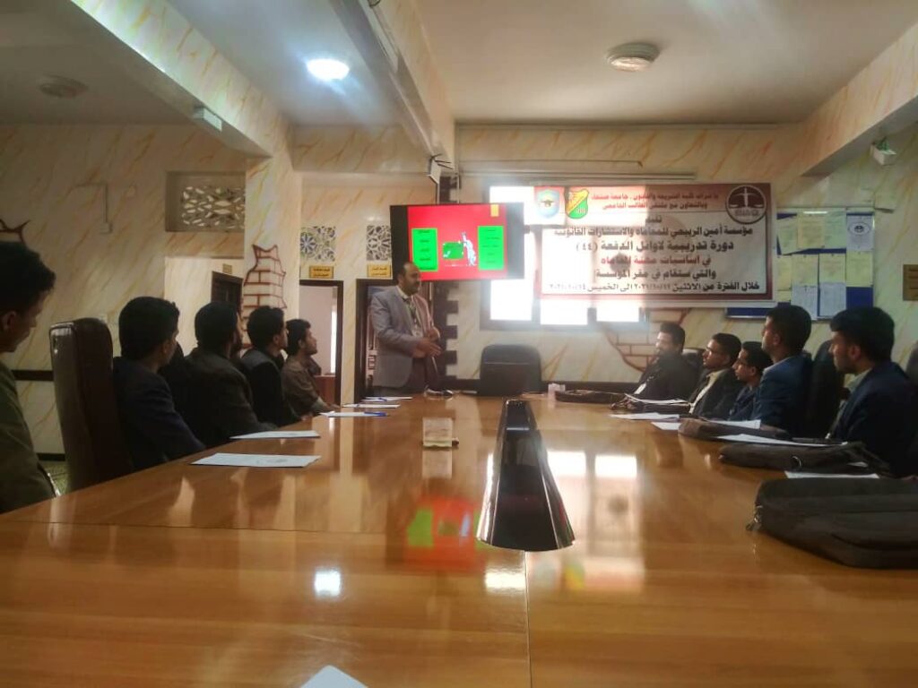 عقدت اليوم بصنعاء دورة تدريبية لأوائل الدفعة 44 من كلية الشريعة والقانون بجامعة صنعاء حول أساسيات مهنة المحاماة التي تنظمها مؤسسة أمين الربيعي للمحاماة والاستشارة القانونية.