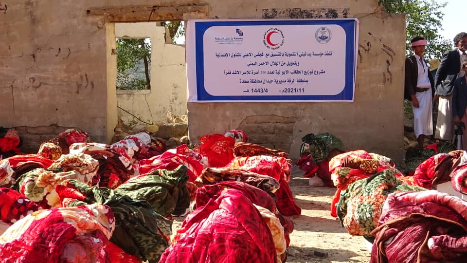 ويستهدف المشروع الذي ينفذ بالتعاون مع الهلال الأحمر اليمني ٢٥٠ أسرة بالحقيبة الايوائيةالتي تحتوي على مطابخ وبطانيات.