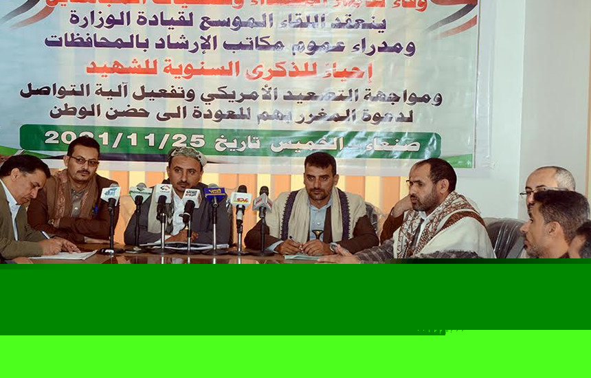 وشدد نائب وزير الارشاد في اللقاء الموسع لقيادة الوزارة ومدراء عموم مكاتب الارشاد بالمحافظات بمناسبة احياء الذكرى السنوية للشهيد ومواجهة التصعيد وتفعيل آلية التواصل لدعوة المغرر بهم للعودة إلى حضن الوطن والذي عقد أمس الخميس بصنعاء شدد على ضرورة استنهاض الأمة وتحفيز الناس على مواجهة العدوان والتصعيد الأمريكي وأضاف أن المرتزقة الذين يعملون في صف العدوان لا يمتلكون مشروع وأنهم يتحركون وفق الاملاءات الخارجية .