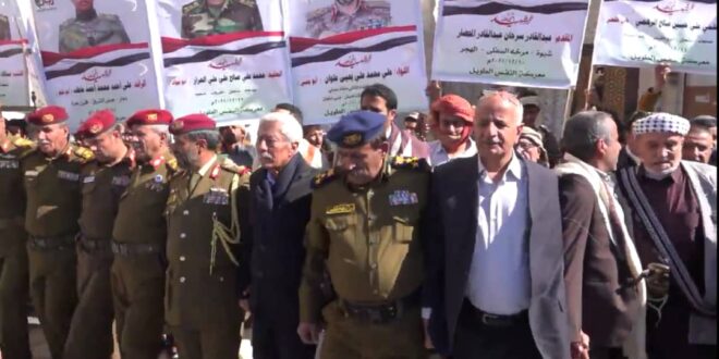 في موكب جنائزي مهيب شيع أبناء محافظة شبوة وشخصياتها الاجتماعية ومشائخ قبائل المحافظة في العاصمة صنعاء جثمان الشهيد المقدم عبدالقادر سرحان عبدالقادر المحضار وعدد من رفاقة الذين ارتقوا شهداء في ً في ساحات العزة والكرامة دفاعاً عن الدين والوطن.