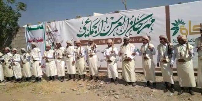 حيث شهد مهرجان العرس الجماعي توافد حشود جماهيرية كبيرة من أبناء المديريات المحررة في المحافظتين لمشاركة العرسان فرحتهم بهذه المناسبة السعيدة التي تجسد اسمى معاني التكافل الاجتماعي التي رعتها الهيئة العامة للزكاة في عدد من المحافظات