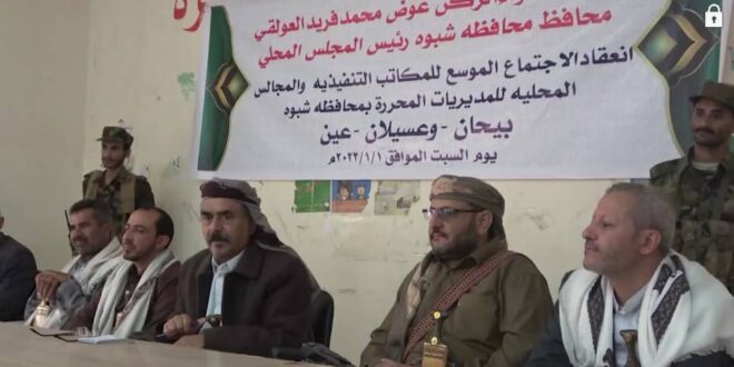 وفي الاجتماع أكد محافظ شبوة اللواء الركن عوض العولقي أن هدف الامارات في شبوة هو السيطرة على الموانئ النفطية الإستراتيجية وهما ميناء بلحاف وميناء النشيمة عبر ادواتهم من المرتزقة كما حذر المحافظ من التواصل مع العدوان أو القيام بأي من الأعمال التخريبية في المديريات المحررة واعتبر ومن يقوم بذالك خائن وعميل وسيتم التعامل معه بحزم مؤكدا وقوف كل أحرار شبوة مع الجيش واللجان الشعبية لصد العدوان ومرتزقتهم في معركة الدفاع عن الوطن وسيادتة واستقلاله