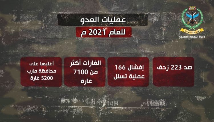 وأفاد سريع بأن التحالف استمر خلال العام 2021م في شن الغارات على بلادنا وكذلك في فرض الحصار إضافة الى محاولته من خلال تشكيلاته العسكرية المختلفة فرض سيطرته واحتلاله لمناطق عدة من البلاد ، مؤكداً أن قوات الجيش واللجان الشعبية تصدت خلال العام 2021م لـ 223 محاولة هجومية وأفشلت 166 محاولة تسلل .