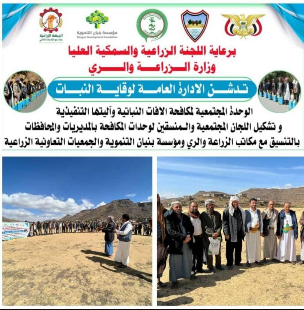 وفي التدشين تم تشكيل لجان مجتمعية من المزارعين والمرشدين المحليين ضمن الجمعيات الزراعية وتشبيكها مع إدارة وقاية النباتات، بما يكفل جهوزيتها للتصدي للآفات النباتية، كما تم اختيار منسقين لوحدة المكافحة على مستوى القاع الزراعي، والمديرية في إطار خطة الوزارة لتعميم هذه الآلية على بقية مديريات المحافظة والمحافظات الأخرى.