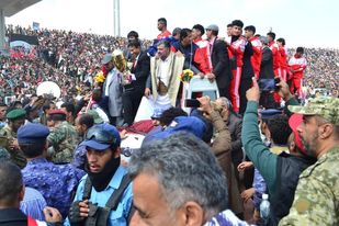 شهد ملعب مدينة الثورة الرياضية اليوم حفلا جماهيريا لاستقبال وتكريم أعضاء بعثة المنتخب الوطني لناشئي كرة القدم، المتوج بكأس غرب آسيا بحضور أعضاء المجلس السياسي الأعلى محمد علي الحوثي وجابر الوهباني وأحمد الرهوي.