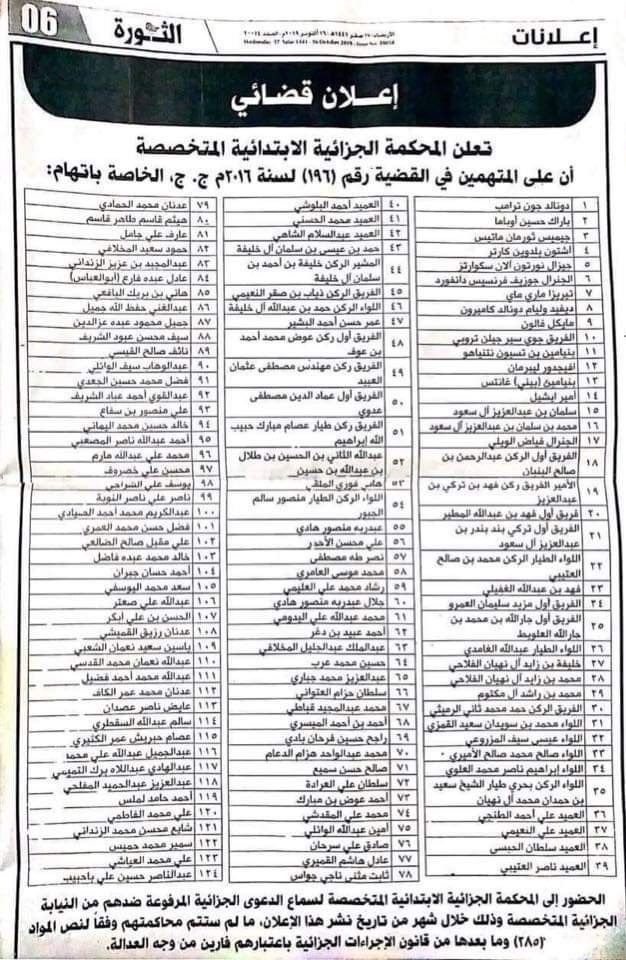 ونشرت المحكمة الجزائية المتخصصة في صحيفة الثورة في عددها الصادر اليوم الاربعاء اعلانا من صفحة كاملة دعا 124متهما للمثول امامها خلال شهر من تاريخ نشر الاعلان لسماع الدعوى الجزائية المرفوعة ضدهم من قبل النيابة الجزائية المتخصصة مالم ستتم محاكمتهم وفقا لنص المادة 285من قانون الاجراءات الجزائية باعتبارهم فارين من وجه العدالة