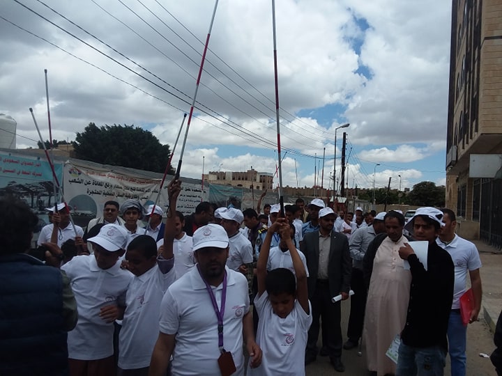 رفعوا عصيهم في مسيرة اليوم العالمي للعصا البيضاء امام مقر الامم المتحدة بصنعاء للتنديد بحصار العدوان الامريكي السعودي الاماراتي لليمن وطالب مكفوفي اليمن في وقفتهم الاحتجاجية التي