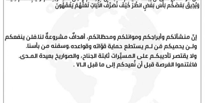 وقالت ألوية الوعد الحق في بيان صادر عنها ” مخاطبة الامارات : ان أبراجكم وموانئكم أهداف مشروعة لنا ولن يحميكم من لم يستطيع حماية قواته وقواعده وسفنه من بأسنا ، ولا يقتصر تأديبكم على المسيرات ثابتة الجناح والصواريخ بعيدة المدى فاغتنموا الفرصة قبل ان نعيدكم الى ما قبل الـ 71 أي الى ما قبل اكتشاف النفط والنهضة العمرانية التي شهدتها الامارات بعد ذلك التاريخ.