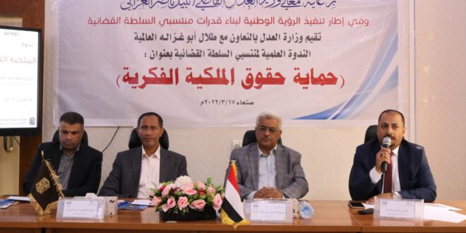 وأوضح رئيس هيئة التفتيش القضائي -في الندوة العلمية لمنتسبي السلطة القضائية التي نظمتها وزارة العدل بصنعاء ولمدة يوم واحد وبالتعاون مع مؤسسة طلال أبو غزالة بعنوان حماية حقوق الملكية الفكرية والتي يشارك فيها 27 قاض وقانوني – أوضح أن اليمن يجب أن تواكب العالم في حماية الملكية الفكرية حتى لا نكون في ضمن الدول المتخلفة والمتأخرة في هذا المجال.