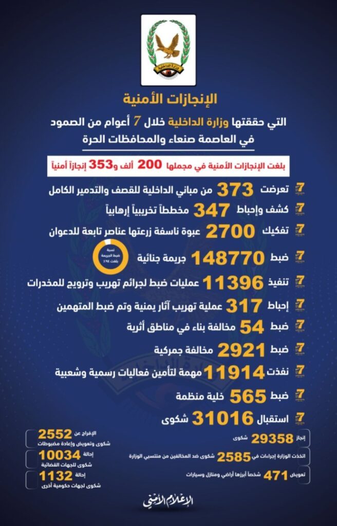 كشف الناطق الرسمي باسم وزارة الداخلية العميد عبدالخالق العجري. اليوم الثلاثاء. عن انجازات وزارة الداخلية خلال سبعة أعوام من العدوان الامريكي السعودي الاماراتي.