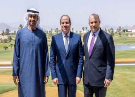 وعقد رئيس الوزراء الإسرائيلي نفتالي بينيت محادثات ثلاثية الاثنين في مصر مع الرئيس المصري عبد الفتاح السيسي وولي عهد أبو ظبي الشيخ محمد بن زايد آل نهيان.