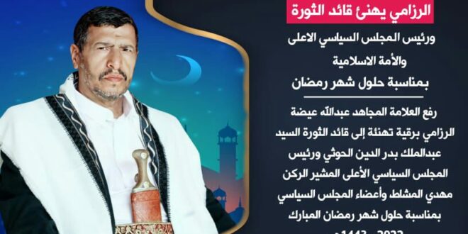 رفع العلامة المجاهد عبدالله عيضة الرزامي برقية تهنئة إلى قائد الثورة السيد عبدالملك بدر الدين الحوثي ورئيس المجلس السياسي الأعلى المشير الركن مهدي المشاط وأعضاء المجلس السياسي بمناسبة حلول شهر رمضان المبارك 2022م 1443هـ