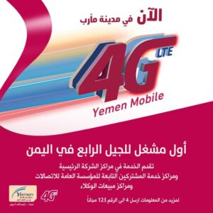 دشنت شركة يمن موبايل مساء يوم أمس خدمة الفور جي في مدينة مأرب ، لتكون بذلك اول شركة تطلق الخدمة في المحافظة