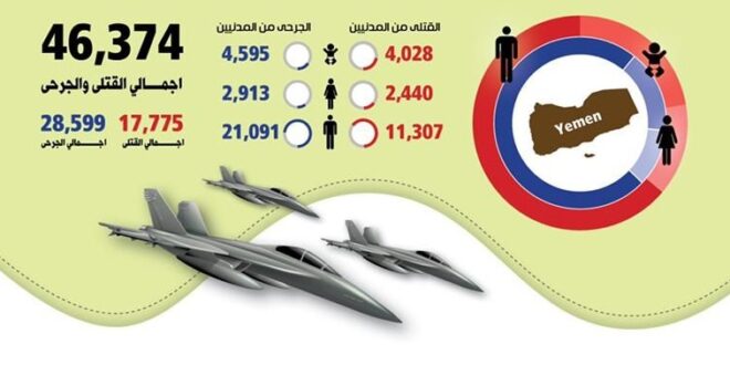 استشهاد وجرح 46,374 مواطنا بينهم 8 آلاف و623 طفلا بغارات العدوان خلال 2600 يوم