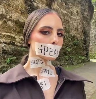 كما سلطت، الضوء على سياسة العزل وتكميم الأفواه وحرمان الأسرى من أبسط حقوقهم، بوضعها لاصقًا على فمها وجسدها وقد كتبت عليه عبارة “فلسطين حرة” و”لا نستطيع التنفس منذ 1948″ في إشارة إلى بدء الاحتلال الإسرائيلي لدولة فلسطين عام 1948.