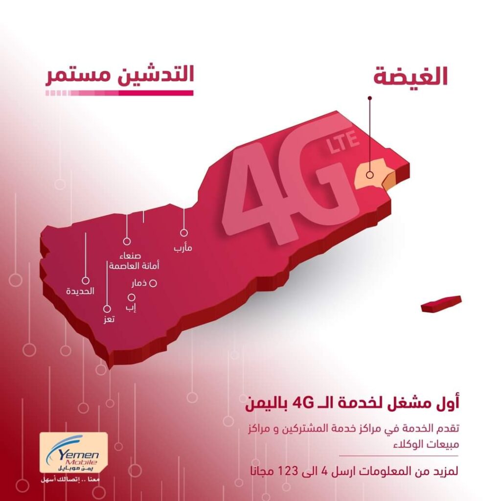 اعلنت شركة يمن موبايل يومنا هذا الأحد الموافق 12 من شهر يونيو تدشين خدمة الفور جي في مدينتي الغيظة بمحافظة المهرة ، في سباق مع الزمن لإنجاز شبكة الـ4G في مختلف المدن اليمنية