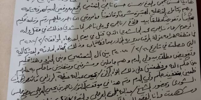 وقام كلٌ من الشيخ علي مقبل الثمثمي وهارون محسن ربيع وعصام يحي الثمثمي ومحسن مهدي عبدالوهاب الثمثمي وكذلك الشيخ مجاهد هادي محسن حجي والاخ محسن حسن ناجي الثمثمي بعمل رقم وقاعدة تحكيم تحكيما وتفويضا مطلقا بيد ولي الدم الاخ ناجي محمد علي ناصر الحاشدي وذلك في مقتل ولده عمار