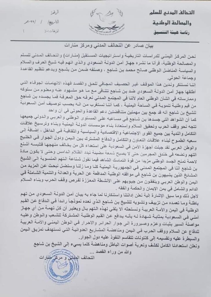 نحن المركز اليمني للدراسات التاريخية واستراتيجيات المستقبل (منارات) والتحالف المدني للسلم والمصالحة الوطنية، قرأنا ما نشره جهاز أمن الدولة السعودي والذي اتهم فيه شيخ العرف والسلام والسياسة المناضل الوطني صالح محمد بن شاجع، وصنفه ضمن من يشجع ويدعم تنظيم القاعدة وجماعة الحوثي.