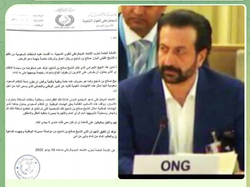 أدانت الأمانة العامة لحزب الاتحاد الديمقراطي للقوى الشعبية، ما أقدمت عليه السلطات السعودية من تلفيق اتهامات للشيخ القبلي البارز صالح بن شاجع ورجال أعمال وشركات خاصةً بتهمة دعم الإرهاب.