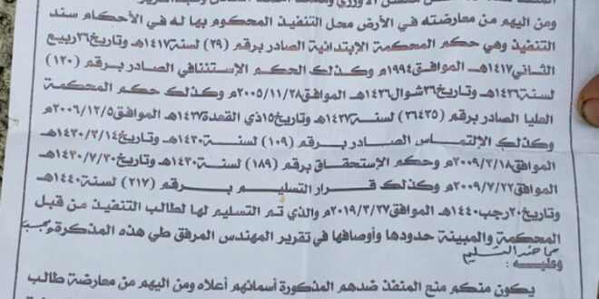واضاف محمد الاوزري بانه اضطر لرفع هذه المذكره لمناشدة للقيادة السياسية بصنعاء وذالك لانقاذ أرضه وانصافة الكائنه في ارض في مسقي دحنان اوطان بني الحارث الخميس والتي صدر الحكم النهائي والتوجيهات الصارمة من الجهات المختصة وسلمت الارض في حينها لكن العصابات حاولت اخذها من جديد.