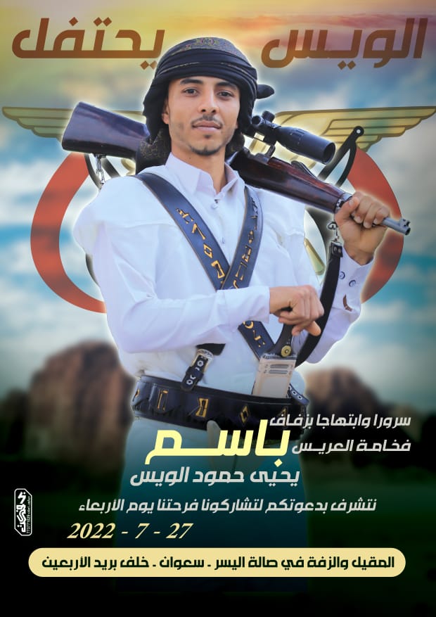 يحتفل الاخ العزيز يحيى حمود الويس يوم الاربعاء القادم بمناسبة زفاف نجله الشاب الخلوق باسم وذلك في صالة اليسر الكائنة في منطقة سعوان شارع الاربعين خلف بريد الاربعين.