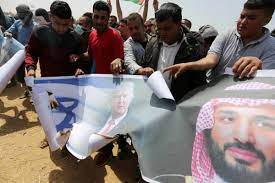 كما أبرز المحتجون تورط محمد بن سلمان في تعذيب وقتل الصحفي السعودي المغدور جمال خاشقجي عام 2018.