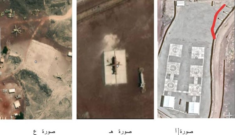 الصورة (أ ) وتحوي ستة مهابط والى جانبها ورش الصيانة اما العربات الجانبية المتواجدة في نفس الصورة فهي بطاريات باتريوت وحاولنا التاكد من ذلك عبر مصادر مختلفة