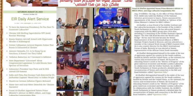 زفّت رئيسة معهد شيللر لعالمي، السيدة هيلجا لاروش. رئيسة معهد شيللر العالمي. المعروفة بسيدة طريق الحرير الجديد، وهي أرملة عراب البريكس المفكر العظيم ليندون لاروش، ومعها أسرة معهد شيللر العالمي وفي المقدمة السيد/ حسين العسكري. رئيس منطقة جنوب غرب آسيا في معهد شيللر العالمي، أنباء قرار دولة البروفيسور/ عبدالعزيز صالح بن حبتور. رئيس مجلس الوزراء اليمني بتعيين السيد/ فؤاد الغفاري. مستشاراً لرئاسة الوزراء لشؤون دول بريكس، وفي تهنئتهم لبلادنا بتحقيق هذا السبق وهذا المستوى من تثبيت بريكس اليمن والتعبير عن موقف الصف مع دول بريكس، جاء في التهنئة العالمية، التي يقرأها الأن كبار المفكرين والخبراء الإستراتيجيون حول العالم، ما يلي؛