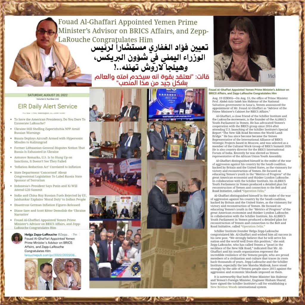 زفّت رئيسة معهد شيللر لعالمي، السيدة هيلجا لاروش. رئيسة معهد شيللر العالمي. المعروفة بسيدة طريق الحرير الجديد، وهي أرملة عراب البريكس المفكر العظيم ليندون لاروش، ومعها أسرة معهد شيللر العالمي وفي المقدمة السيد/ حسين العسكري. رئيس منطقة جنوب غرب آسيا في معهد شيللر العالمي، أنباء قرار دولة البروفيسور/ عبدالعزيز صالح بن حبتور. رئيس مجلس الوزراء اليمني بتعيين السيد/ فؤاد الغفاري. مستشاراً لرئاسة الوزراء لشؤون دول بريكس، وفي تهنئتهم لبلادنا بتحقيق هذا السبق وهذا المستوى من تثبيت بريكس اليمن والتعبير عن موقف الصف مع دول بريكس، جاء في التهنئة العالمية، التي يقرأها الأن كبار المفكرين والخبراء الإستراتيجيون حول العالم، ما يلي؛