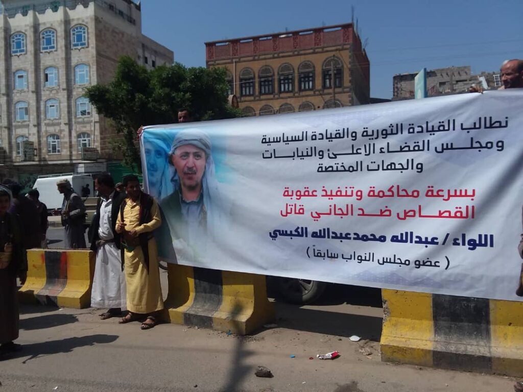 نفذ العشرات من المواطنين اليوم الاثنين وقفة احتجاجية حاشدة أمام مكتب النائب العام في العاصمة صنعاء، لمطالبة مجلس القضاء الأعلى والنيابة العامة بسرعة محاكمة وتنفيذ القصاص من قاتل عضو مجلس النواب السابق عبدالله محمد الكبسي.