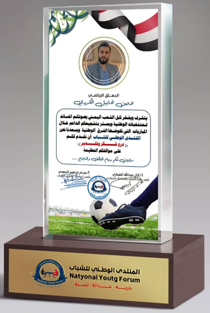 كرم المنتدى الوطني للشباب المعلق الرياضي “لاوين هابيل الكردي” بمنحه درع المنتدى تقديراً وعرفاناً لما يقدمه من تشجيع ومساندة كبيرة لمنتخبات اليمن الرياضية وخصوصاً فرق كرة القدم ..