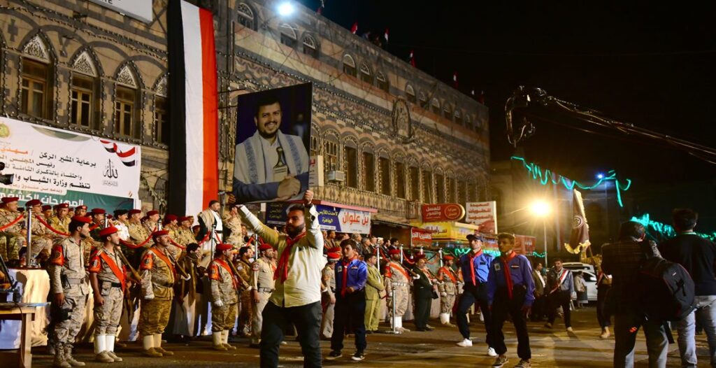 ورفع شباب الكشافة ونجوم المنتخبات الرياضية علم الجمهورية اليمنية وصور قائد الثورة السيد عبدالملك بدر الدين الحوثي، والشعارات المعبرة عن الفرحة بقدوم هذه المناسبة الوطنية التي مثلت عنواناً للتخلص من قوى الهيمنة والوصاية وتصويب المسار الوطني.