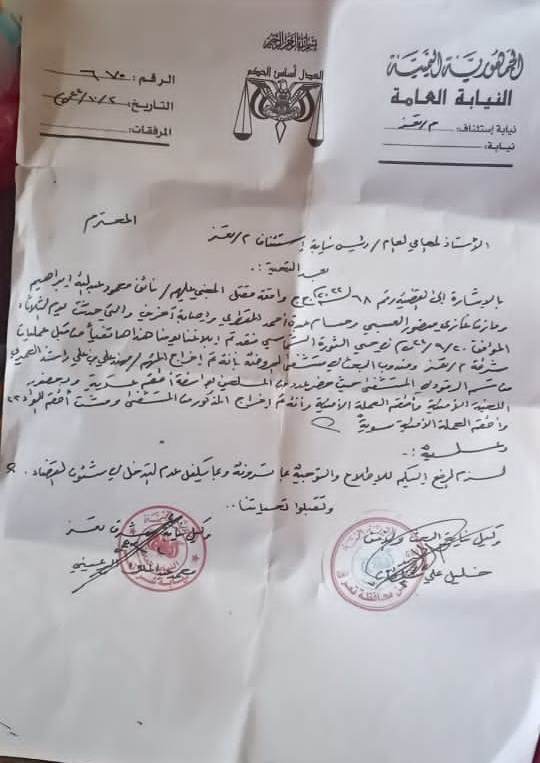 وأوضح وثيقة رسمية صادر عني نيابتي البحث وشرق تعز، قيام مسلحين على اطقم عسكرية بتهريب متهم في حادثة حي الثورة من احد المشافي الخاصة بالمدينة.