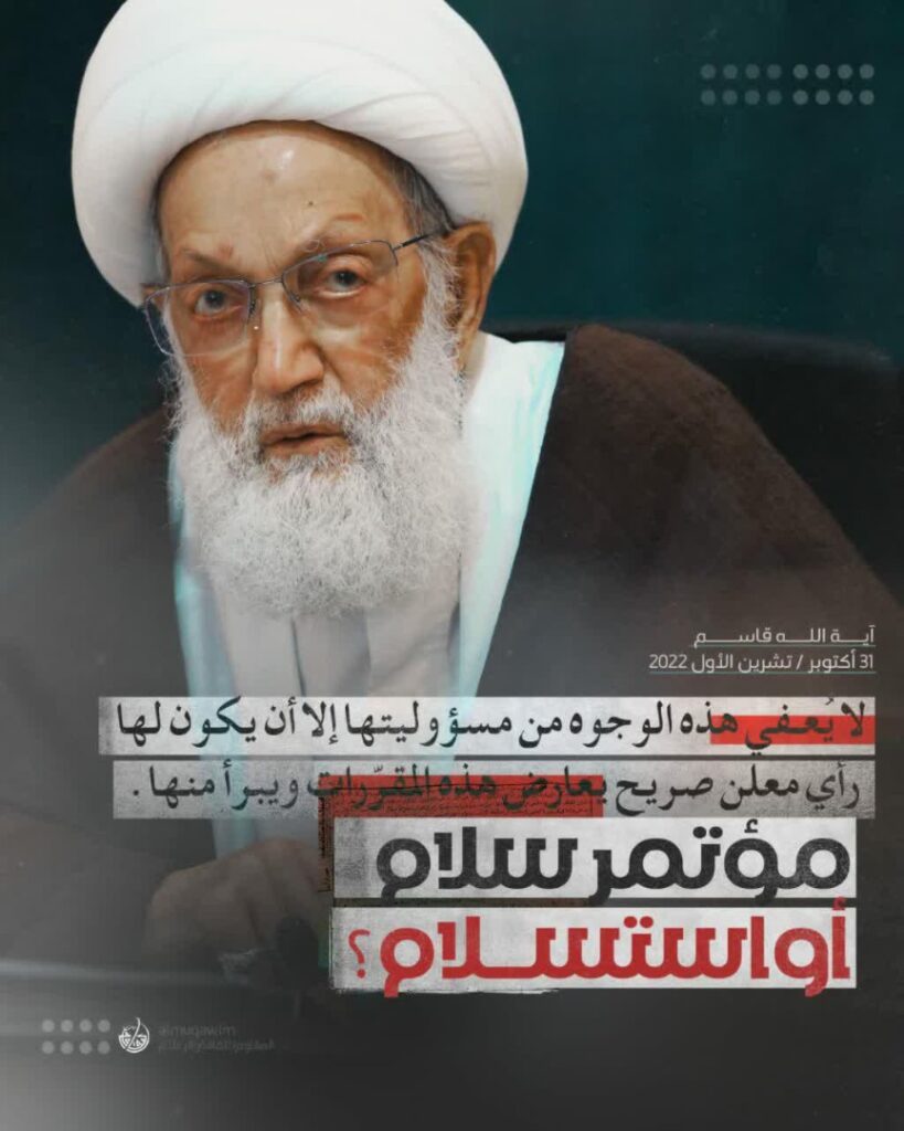 نشر المرجع البحريني الكبير سماحة الشيخ/ آية الله عيسى أحمد قاسم بيانا حول ما يسمى مؤتمر التعايش في البحرين وفيما يلي نص البيان الذي جاء تحت عنوان مؤتمرُ سلامٍ أو استسلام؟:-