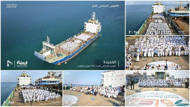 الحفل نظمه مكتب الهيئة العامة للزكاة على متن سفينة (روابي) الإماراتية، قبل أن ينتقل العرسان إلى ساحة الرئيس الشهيد الصماد للعروض.