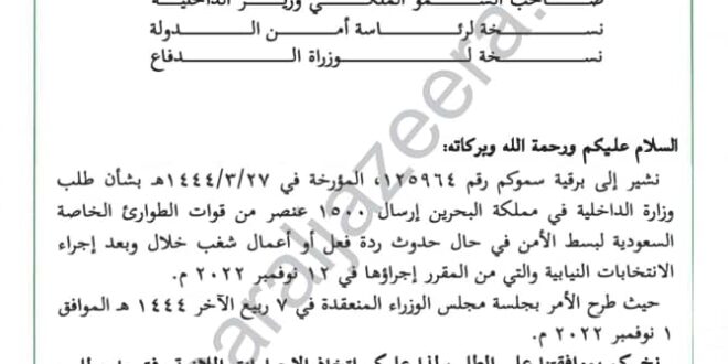 وثيقة تكشف موافقه مملكة البحرين على استقبال قوات الطوارئ الخاصة السعودية تحسبا لأي ردت فعل شعبية على نتائج الانتخابات البرلمانية القادمة
