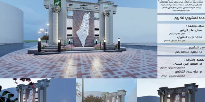 وتبلغ مساحة المشروع الذي يجري انشاؤه بتمويل واشراف من قبل صندوق النظافة والتحسين بالأمانة في تقاطع الستين حدة “جولة المصباحي” 10.4 متر عرض، 9 متر ارتفاع ، ويشمل مساحات مرئية ذات مدلول بصري جمالي ترتسم عليها خارطة فلسطين من النهر للبحر مبينة أسماء المدن الفلسطينية، ويتوسط خريطة المشروع الذي يستمر تنفيذه كما يقول المختصون 90يوما عمودان رئيسيان يحمل الأول شعار الصرخة. والثاني محور المقاومة