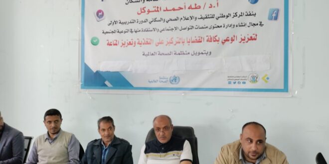نظمها في خمسة أيام المركز الوطني للتثقيف والإعلام الصحي والسكاني بوزارة الصحة بدعمٍ من منظمة الصحة العالمية، وضمت 35 مشاركاً من مدراء التثقيف الصحي وإعلاميي الصحة بالمحافظات وكوادر المركز في الإعلام والتثقيف والإنتاج الفني وتعزيز الصحة.