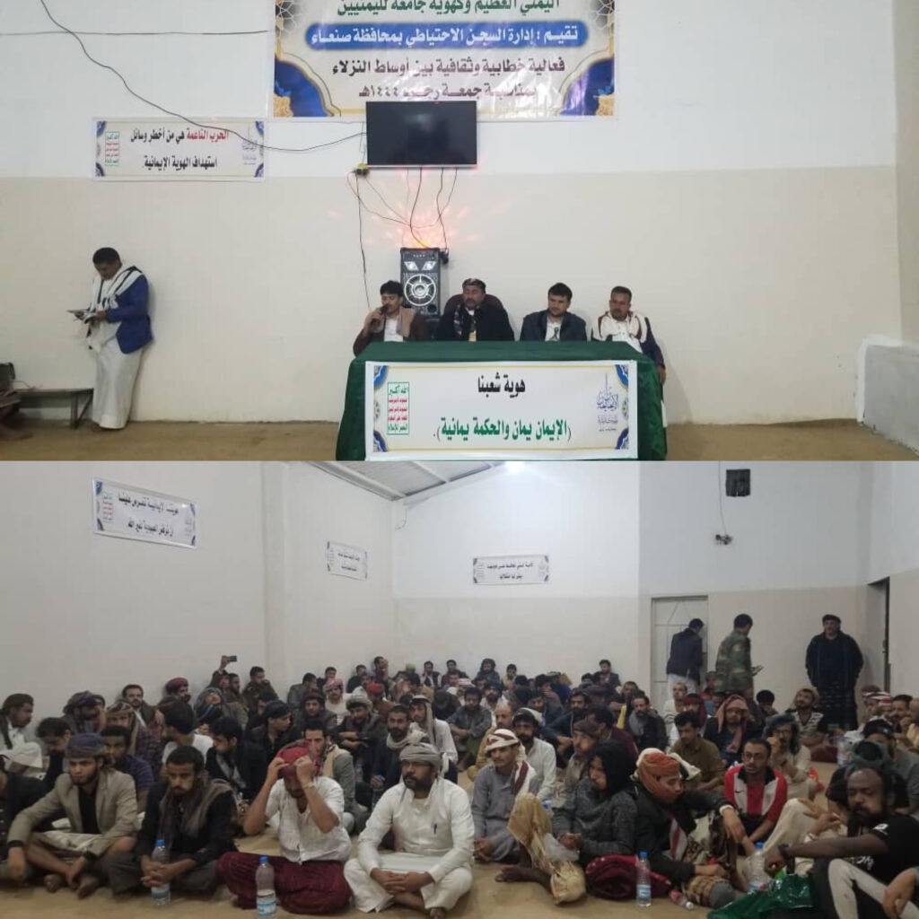 أقامت الإصلاحية الإحتياطية بمحافظة صنعاء اليوم فعالية بمناسبة ذكرى جمعة رجب، تحت شعار جمعة رجب وإسلام أهل اليمن، هوية إيمانية وحكمة يمانية تضمنت الفعالية محاضرات وحلقات دينية وموشحات وموالد وبرع وزوامل وقصائد معبرة عن هذه المناسبة.